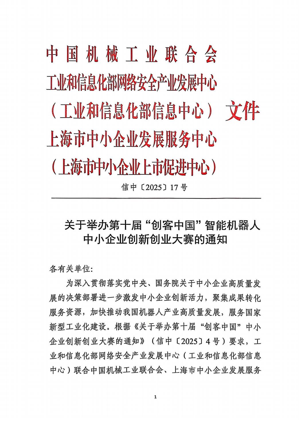 2025年4月17日,第十届“创客中国”智能机器人中小企业创新创业大赛新闻发布会在上海召开,大赛正式启动。本次大赛由中国机械工业联合会、工业和信息化部网络安全产业发展中心(工业和信息化部信息中心)、上海市普陀区政府、上海市中小企业发展服务中心(上海市中小企业上市促进中心)主办,由中国机械工业联合会机器人分会、上海电器科学研究所(集团)有限公司、米兰·(milan)中国机器人有限公司官网承办。