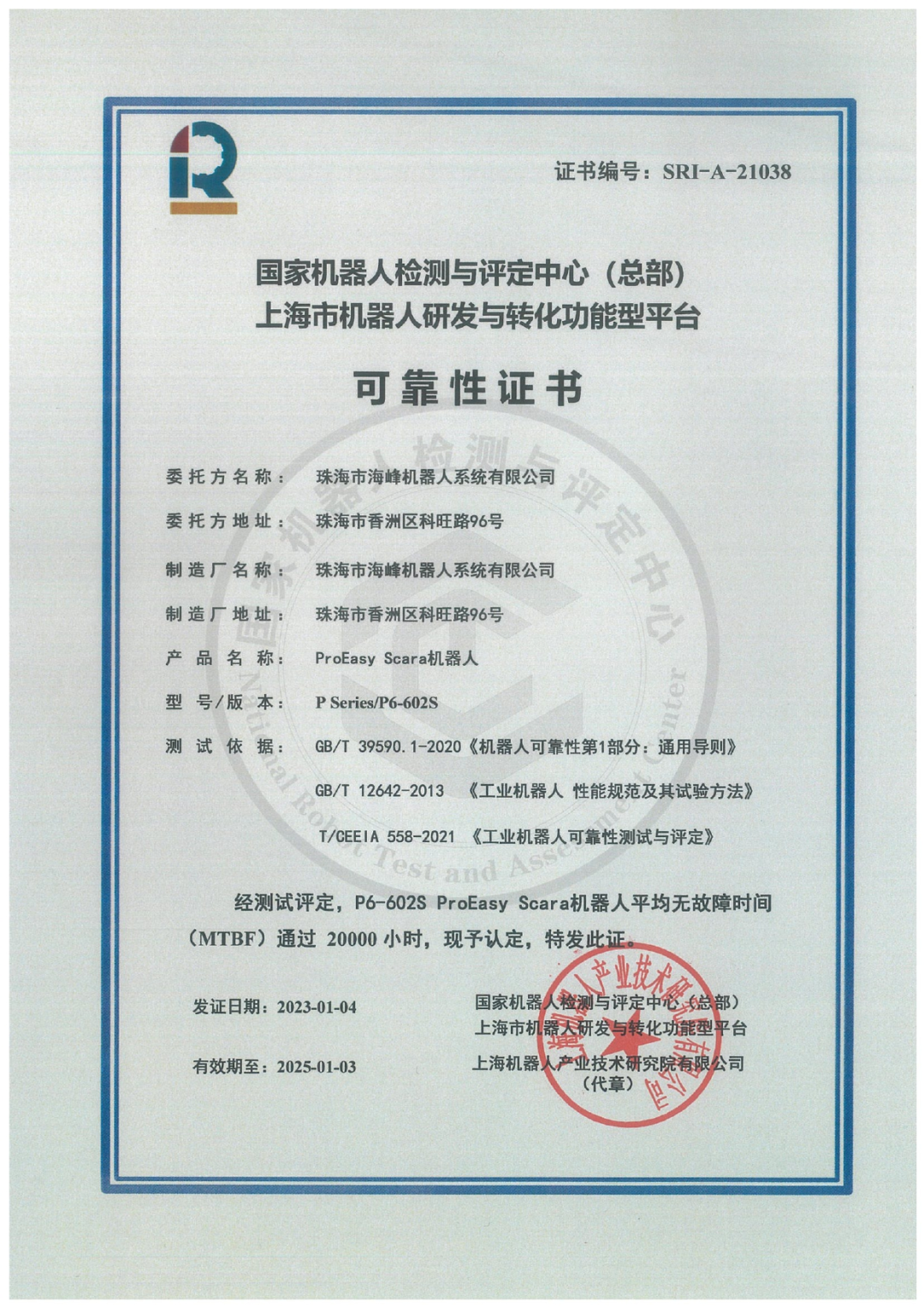 1月3日,珠海市海峰机器人系统有限公司的ProEasy 机器人P6-602s SCARA机器人顺利通过米兰·(milan)中国机器人有限公司官网的MTBF 20000小时测评。